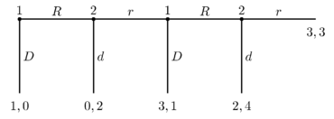 For a game that ends after four rounds, this reasoning proceeds as follows. If we were to reach the last round of the game, Player 2 would do better by choosing d instead of r, receiving 4 coins instead of 3. However, given that 2 will choose d, 1 should choose D in the second to last round, receiving 3 instead of 2. Given that 1 would choose D in the second to last round, 2 should choose d in the third to last round, receiving 2 instead of 1. But given this, Player 1 should choose D in the first round, receiving 1 instead of 0.