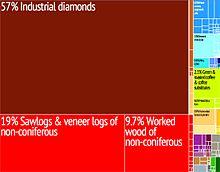 It has been estimated that up to 8% of the country is covered by forest, with the densest parts generally located in the southern regions. The forests are highly diverse and include commercially important species of Ayous, Sapelli and Sipo.[83] The deforestation rate is about 0.4% per annum, and lumber poaching is commonplace.[84] The Central African Republic had a 2018 Forest Landscape Integrity Index mean score of 9.28/10, ranking it 7th globally out of 172 countries.[85]