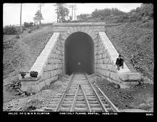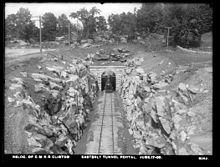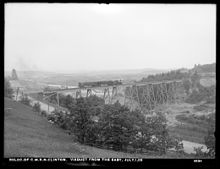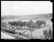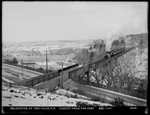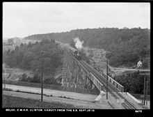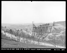 The new portion of the Central Massachusetts Branch started just west of West Berlin Junction in Berlin where the Central Massachusetts Branch connected with the Fitchburg Line of the NYNH&H. From there it ran northwest into Clinton through a 1,110-foot (340 m)-long tunnel. The western portal of the tunnel opened onto a 917-foot viaduct near the site of the Wachusett Dam that passed over Route 70 and the Nashua River before connecting with the WN&P Division main line at Clinton Junction. Traffic over the Central Massachusetts Branch followed the WN&P Division main line through Sterling into Oakdale where a redesigned junction routed it back onto the original Central Massachusetts Branch. Just before Clinton Junction an additional connection branched off at Reservoir Switch leading to East Switch on the WN&P Division to allow traffic to approach the Central Massachusetts Branch from the north or continue from the Central Massachusetts Branch north along the WN&P Division main line. The first train passed over the new route on June 2, 1903 while the old track was officially removed from through service on June 15 but remained in place and used during the remainder of the reservoir construction, some of it being re-gauged to 3' to allow construction trains to utilize it.[15] Under this arrangement the WN&P main line between Oakdale and Sterling Junction became exceptionally busy as it accommodated B&M traffic from the WN&P Division and the Central Massachusetts Branch as well as NYNH&H traffic heading between Worcester and Fitchburg along the tracks of the original Fitchburg and Worcester Railroad.[1]:29–38