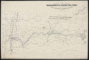 The Massachusetts Central Railroad was organized on September 2, 1869 with James M. Stone of Charlestown elected as its first president.[3] Construction began the following fall despite difficulty in raising capital. The company hired contractor Norman Munson to build the railroad in April 1871 but two years later the Panic of 1873 forced Munson into bankruptcy and halted construction.[4] The railroad stagnated until June 5, 1878 when new president Silas Seymour called a stockholders meeting.[5]:127 The stockholders elected a new Board of Directors which appointed George S. Boutwell president in 1879[5]:128 and rehired Munson to resume construction.[6] That same year the Massachusetts General Court amended the railroad's charter to allow for several new expansions. The most significant was an extension east to Cambridge which eliminated the connection with the Fitchburg at Stony Brook and placed the route's eastern terminus at North Cambridge Junction with the Middlesex Central Branch of the Boston and Lowell Railroad (B&L).[5]:223 Other amendments included a branch from Amherst to a connection with the Troy and Greenfield Railroad in West Deerfield[5]:101 and approval to connect with and build over the route of the never-constructed Holyoke and Belchertown Railroad through Granby and South Hadley.[7]