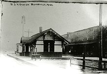 Meanwhile, westward construction continued with tracks reaching Oakdale and Jefferson by June 1882.[8] In 1883 the selling agents for the company's bonds, Boston-based Charles A. Sweet and Co., declared bankruptcy. The railroad ceased operations and construction on May 16 and remained in limbo for the next 29 months.[9]