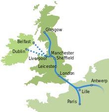 The line would have run from the Liverpool Docks to Sheffield using the disused Woodhead Tunnel and then turned south via the Erewash Valley, joining the former Great Central Main Line (much of whose trackbed was still intact) south of Leicester. At a rebuilt Ashendon Junction it would have joined the Chiltern Main Line, running alongside it on new tracks, then paralleling the M25 motorway, entering a new tunnel between Leatherhead and Merstham and then running alongside existing railways via Tonbridge to the Channel Tunnel terminal at Folkestone.[1] An alternative route would have seen the line joining High Speed 1 to the tunnel, if the latter railway were to allow non-passenger trains.