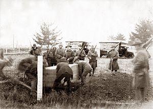 Locally, Wobblies were active in the union from at least 1914.[10] Although open conflict was avoided, tensions simmered on both sides. 1914-1918 saw scattered strikes in the mining and mill industries.[10][11] IWW efforts to open a hall for local members were met by opponents of the IWW who lived in Centralia. In 1917, the Wobblies tried to open a hall using an alias on the lease agreement, but the landlord evicted the group when he discovered its identity.