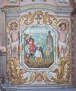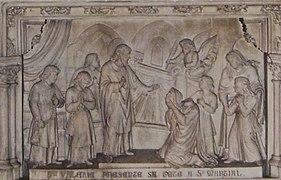 The martyrdom of St. Miliau, who holds his severed head as blood gushes from his neck. Retable of the Passion at Lampaul-Guimiliau.