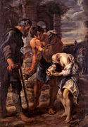 The topos can be traced to two sources.[1] In a homily on Saints Juventinus and Maximinus, John Chrysostom asserted that the severed head of a martyr was more terrifying to the devil than when it was able to speak.[2] "He then compared soldiers showing their wounds received in battle to martyrs holding their severed head in their hands and presenting it to Christ".[2] The other source was the Western vita of Saint Denis, founder of the see of Paris, who was identified in the text with Dionysius the Areopagite. John the Baptist, the best known beheaded saint, is not considered a cephalophore, since he did not hold his own head in his hands.[3]