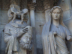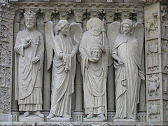 St. Denis's (second from right) has angelic companions showing him polite concern; portal from Notre Dame de Paris (probably 19th century replacements)