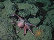 Right: An octopus (Benthoctopus sp.) on the Davidson Seamount at 2,422 m depth