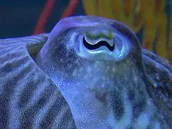 Most cephalopods rely on vision to detect predators and prey, and to communicate with one another.[18] Consequently, cephalopod vision is acute: training experiments have shown that the common octopus can distinguish the brightness, size, shape, and horizontal or vertical orientation of objects. The morphological construction gives cephalopod eyes the same performance as sharks'; however, their construction differs, as cephalopods lack a cornea, and have an everted retina.[18] Cephalopods' eyes are also sensitive to the plane of polarization of light.[19] Unlike many other cephalopods, nautiluses do not have good vision; their eye structure is highly developed, but lacks a solid lens. They have a simple "pinhole" eye through which water can pass. Instead of vision, the animal is thought to use olfaction as the primary sense for foraging, as well as locating or identifying potential mates.