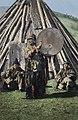 The drums of the North American Indians are typically large, double-sided frame drums or cylinder drums. In the past, they were generally considered sacred and were not allowed to be played by everyone. The particularly revered "hanging" drum, a frame drum set up horizontally with four bars attached to the side, was kept by a "drum guard" among the Shoshone. Today, at the Powwow, a social gathering lasting several days, large cylinder drums are used in addition to flat drums, which are placed directly on the floor and beaten by several men sitting on chairs in the vicinity to accompany the singing.[4] An example of a ceremony at the Potlatch Festival is the necromancy dance (Coast Salish Winter Dance ) of the coastal Salish on the Northwest American Pacific coast, in which male participants usually accompany drumming and singing at a fireplace at night, one after the other, made-up and costumed dancers.[5]