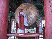 - Beopgo is a large barrel drum that Buddhist monks in Korea beat with mallets during religious ceremonies outdoors. The drums are set up in their own pavilion on the temple grounds.[7] The body, covered with cowhide, is brightly painted with kites flying on clouds.[8] Large barrel drums are generally part of the daily ceremonies in Buddhist temples in East Asia and on special feast days. In Japan these drums are called taiko.