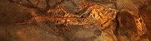 Ceresiosaurus was much more elongated than its relatives, reaching 3 metres (9.8 ft) in length, and had fully developed flippers with no trace of visible toes. It had multiple elongated phalanges, making the flippers much longer than in most other nothosaurs, and more closely resembling those of the later plesiosaurs.[3] Ceresiosaurus also had the shortest skull of any known nothosaur, which further increased its resemblance to plesiosaurs.