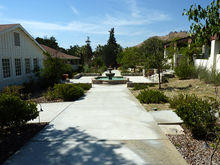 Chavez wanted a more remote base for his movement than Forty Acres, especially one where he could experiment with his ideas about communal living.[191] To this end, the Hollywood movie producer Edward Lewis, a wealthy supporter of Chavez's, fronted the purchase of an old tuberculosis sanatorium in Keene, along the foothills of the Tehachapi Mountains, for the union.[192] Chavez named this new base Nuestra Señora Reina de la Paz ("Our Lady Queen of Peace"), although it became commonly known just as "La Paz."[193] Renovating the existing buildings,[194] he invited various families to come and live there.[195] In creating this commune, he drew on Gandhi's experiments with ashrams in India;[195] he envisioned it as a retreat centre where workers could come for three day retreats modeled on the Roman Catholic cursillo.[194] La Paz became the union's new headquarters, something that various backers and funders were critical of due to its remote location;[196] Chavez said that this was necessary for his security, particularly following allegations of a plot against his life.[197] At night, the perimeter of the commune was patrolled by armed guards.[198] The organization at La Paz was often chaotic, with frustrated detractors in the movement referring to it as "Magic Mountain."[199] Amid his growing frustrations with Chavez's leadership, Itliong resigned in October 1971.[200]