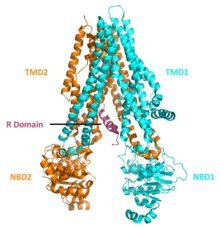 The CFTR gene is approximately 189 kb in length, with 27 exons and 26 introns.[30] CFTR is a glycoprotein with 1480 amino acids. The protein consists of five domains. There are two transmembrane domains, each with six spans of alpha helices. These are each connected to a nucleotide binding domain (NBD) in the cytoplasm. The first NBD is connected to the second transmembrane domain by a regulatory "R" domain that is a unique feature of CFTR, not present in other ABC transporters. The ion channel only opens when its R-domain has been phosphorylated by PKA and ATP is bound at the NBDs.[31] The carboxyl terminal of the protein is anchored to the cytoskeleton by a PDZ-interacting domain.[32] The structure shown (PDB# 1XMI) shows a homopentameric assembly of mutated NBD1, the first nucleotide binding domain (NBD1) of the transporter.