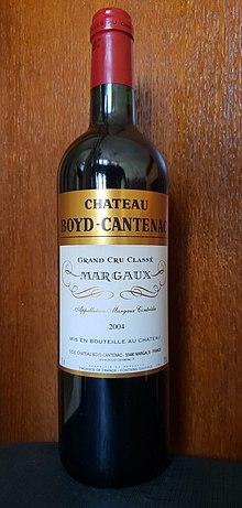Château Boyd-Cantenac is a winery in the Margaux appellation of the Bordeaux region of France. The wine produced here was classified as one of fourteen Troisièmes Crus (Third Growths) in the historic Bordeaux Wine Official Classification of 1855.[1] The vineyard, totalling 46 acres (190,000 m2), is planted with Cabernet Sauvignon, Merlot, Cabernet Franc, and Petit Verdot and abuts other Margaux châteaux, including Château Brane-Cantenac and Château Kirwan. Producing annually 5,000-6,000 cases, Boyd Cantenac makes in addition to its Grand vin, a second wine under the labels Jacques Boyd and Josephine de Boyd.[2]