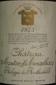 Château d'Armailhac, previously named Château Mouton-d'Armailhacq (historical name from inception, 1750–1955), Château Mouton-Baron Philippe, Mouton Baronne and Château Mouton-Baronne-Philippe (1979–1988), is a winery in the Pauillac appellation of the Bordeaux region of France. The wine produced here was classified as one of eighteen Cinquièmes Crus (Fifth Growths) in the Bordeaux Wine Official Classification of 1855.[1] In 1989, Baroness Philippine decided to restore its original identity to Mouton d’Armailhacq, giving it the name Château d’Armailhac.[2]