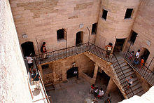 The "château" is a square, three-story building 28 m (92 ft) long on each side, flanked by three towers with large gun embrasures. It was built in 1524–31 on the orders of King Francis I, who, during a visit in 1516, saw the island as a strategically important location for defending the coastline from sea-based attacks.[2]