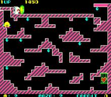 Chack'n Pop is an platform arcade game. The player controls Chack'n, a small yellow creature with extendable legs, through a series of single-screen mazes. He is capable of walking on floors or ceilings but not walls.[1] He can climb steps and traverse high walls by extending his legs until he is tall enough to pass onto the next step.[1] He is also capable of throwing hand grenades to his left or right which, after a short period, explode into a cloud of smoke.[2] Separate fire buttons control rolling to the left or right.[3] Chack'n is killed if caught by the explosion cloud.[3] He is delayed in this process by a series of solid walls.[3] In order to get past the walls, he must free hearts from cages using his hand grenades.[3]