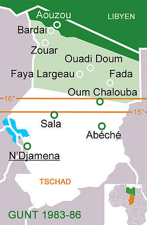 Despite signing the Kano Accord,[50] Libya was incensed that the GUNT did not include any of the leaders of the Volcan Army and had not recognized Libyan claims on the Aouzou Strip. Since 13 April there had been some minor Libyan military activity in northern Chad, and support was provided to the secessionist movement in the south. However, a major response came only after 25 June, when the ultimatum of Chad's neighbors for the formation of a new, more inclusive coalition government expired. On 26 June, 2,500 Libyan troops invaded Chad, heading for Faya-Largeau. The Chadian government appealed for French help. The Libyan forces were first stymied by Goukouni's militiamen, and then forced to retreat by French reconnaissance planes and bombers. In the same month, the factions excluded by the GUNT founded a counter-government, the Front for Joint Provisional Action (FACP), in northern Chad with Libyan military support.[47][49][51]