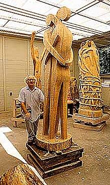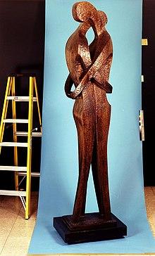 Chaim Goldberg's insatiable desire to create art in many mediums knew no end. He engraved and sculpted in wood, stone, and metal. Here we see a 9 1/2 foot tall carving from oak, titled WE. He would stain his sculptures in various tones and have editions of 8 bronzes cast of each one he chose for editioning. His main advisor was his wife of 65 years, Rachel.