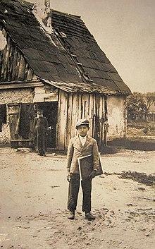 Chaim Goldberg was born in a wooden clapboard house built by his father, a village cobbler. As a young boy of 6 he gravitated to creating little figurines carved from stones. Later he took up drawing and painting with basic shoemaker paints that he found at his father's workbench. He was the ninth child and the first boy after eight girls. He grew up in a religious home in Kazimierz Dolny. He would observe and draw the beggars and klezmers who frequented his home as guests. His father would encourage their stays by letting it be known that the humble Goldberg home was open for those who could not pay for their night stay at any of the inns. They were surely welcome there. These characters became Chaim's early models.[1]