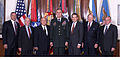 General Henry H. Shelton hosted on 1 December 2000 a conference in the Pentagon for former Chairmen of the Joint Chiefs of Staff. Standing from left to right are: Gen. Colin L. Powell, USA (Ret); Gen. John W. Vessey, USA (Ret); Adm. Thomas H. Moorer, USN (Ret); Gen. Shelton, USA; Gen. David C. Jones, USAF (Ret); Adm. William J. Crowe, Jr., USN (Ret); and Gen. John M. Shalikashvili, USA (Ret).