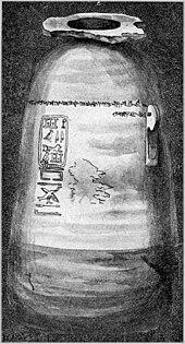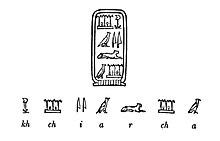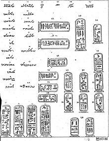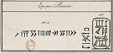 - ^ a b Champollion, Jean-François (1790-1832) Auteur du texte (1828). Précis du système hiéroglyphique des anciens Égyptiens, ou Recherches sur les éléments premiers de cette écriture sacrée, sur leurs diverses combinaisons, et sur les rapports de ce système avec les autres méthodes graphiques égyptiennes, par M. Champollion le jeune. Seconde édition... augmentée de la lettre à M. Dacier relative à l'alphabet des hiéroglyphes phonétiques employés par les Égyptiens sur leurs monumens de l'époque grecque et de l'époque romaine,... pp. 225–233.