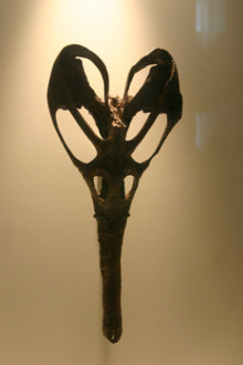 It grew to about 1.50 m (5 ft) long,[6] though C. gigas, the largest species, reached 3–3.5 m (10–12 ft) in length.[7] Champsosaurus vaguely resembled a gharial and, like gharials, it was primarily aquatic, catching fish with its long, tooth-lined jaws. It probably swam with lateral body movements, pinning its limbs against its body to increase its streamline, just like crocodiles and the marine iguana. Behind the eyes, Champsosaurus's skull was very wide, where powerful jaw muscles were attached.[8] Due to specializations in hip and limb anatomy, only females could come ashore to lay eggs, while males primarily lived in water.[9]
