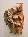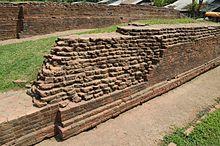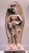 Brahmi inscriptions with Megalithic Graffiti Symbols read "yojanani setuvandhat arddhasatah dvipa tamraparni", meaning "The island of Tamraparni (ancient Sri Lanka) is at a distance of 50 yojanas from Setuvandha (Rameswaram in Tamil Nadu).[7][8] The mast of a ship with Vijayasinha's seal, describing Vijayasinha, the son of the king of Sinhapura of Vanga's marriage to Kuveni – the indigenous "Yakkha queen of Tamraparni".[9] Chandraketugarh features many examples of terracotta art, displaying an unusual degree of precision and craftsmanship. These plaques are comparable to those found at other better-known sites such as Kaushambi and Ahichhatra. The terracotta plaques from these sites often carry similar motifs executed in nearly identical fashion. This similarity suggests an established communication link and common cultural heritage among these sites.