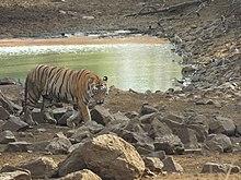 The Tadoba Andhari Tiger Reserve is located approximately 30 km north of Chandrapur near the Erai dam. This park was included in the project tiger since 1973. The total area of the reserve is 625.40 km2. In 2014 the tiger population in Tadoba was 66, that number has gone up to 86. Tadoba is now a home to 86 Tigers despite years of lynching, poaching & other threats.[24] There are many hotels and resorts near Moharli gate, Zari gate and Navegaon gate of the reserve, available for the tourists. The guided tours inside the park are available during early morning and evening time only.[23][25]