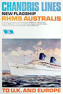 The Patris proved highly popular on the Greece—Australia service, and in 1960 Chandris Line began looking for a second ship.[9] In November 1960 Chandris Line chartered the SS Bretagne (1951) from Societe Generale de Transports Maritimes. During the northern hemisphere summer seasons of 1961 and 1962 the ship was chartered to Caribbean Cruise Line for cruises out of New York City, spending the rest of the year in liner service between the United Kingdom and Australia. In April 1962 the Bretagne was renamed RHMS Brittany, but she was destroyed by a fire while in drydock in April 1963.[2][8][10] The Brittany's UK-Australia version was marketed as Europe-Australia Line.[2]