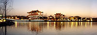 Within the West Park was a running stream and within the walled enclosure of the West Palace were two running streams, one connecting three ponds and another connecting two ponds. The small East Park had a pond the size of those in the West Palace. The Daming Palace and the Xingqing Palace (along the eastern wall of the city) had small lakes to boast. The Serpentine River Park had a large lake within its bounds that was bigger than the latter two lakes combined, connected at the southern end by a river that ran under the main walls and out of the city.[16]