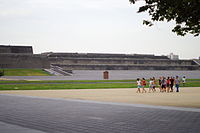 During Tang, the main exterior walls of Chang'an rose 18 ft (5.5 m) high, were 5 miles (8.0 km) by six miles in length, and formed a city in a rectangular shape, with an inner surface area of 30 square miles (78 km2).[14] The areas to the north that jutted out like appendages from the main wall were the West Park, the smaller East Park, and the Daming Palace, while the southeasternmost extremity of the main wall was built around the Serpentine River Park that jutted out as well. The West Park walled off and connected to the West Palace (guarded behind the main exterior wall) by three gates in the north, the walled-off enclosure of the Daming Palace connected by three gates in the northeast, the walled-off East Park led in by one gate in the northeast, and the Serpentine River Park in the southeast was simply walled off by the main exterior wall, and open without gated enclosures facing the southeasternmost city blocks. There was a Forbidden Park to the northwest outside of the city, where there was a cherry orchard, a Pear Garden, a vineyard, and fields for playing popular sports such as horse polo and cuju (ancient Chinese football).[15] On the northwest section of the main outer wall there were three gates leading out to the Forbidden Park, three gates along the western section of the main outer wall, three gates along the southern section of the main outer wall, and three gates along the eastern section of the main outer wall.[16] Although the city had many different streets and roads passing between the wards, city blocks, and buildings, there were distinct major roads (lined up with the nine gates of the western, southern, and eastern walls of the city) that were much wider avenues than the others.[17] There were six of these major roads that divided the city into nine distinct gridded sectors (listed below by cardinal direction). The narrowest of these streets were 82 ft (25 m) wide, those terminating at the gates of the outer walls being 328 ft (100 m) wide, and the largest of all, the Imperial Way that stretched from the central southern gate all the way to the Administrative City and West Palace in the north, was 492 ft (150 m) wide.[18] Streets and roads of these widths allowed for efficient fire breaks in the city of Chang'an. For example, in 843, a large fire consumed 4,000 homes, warehouses, and other buildings in the East Market, yet the rest of the city was at a safe distance from the blaze (which was largely quarantined in East Central Chang'an).[18] The citizens of Chang'an were also pleased with the government once the imperial court ordered the planting of fruit trees along all of the avenues of the city in 740.[19]