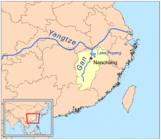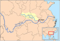 Various sections of the Yangtze have local names. From Yibin to Yichang, the river through Sichuan and Chongqing Municipality is also known as the Chuān Jiāng (川江) or "Sichuan River." In Hubei, the river is also called the Jīng Jiāng (荆江; 荊江) or the "Jing River" after Jingzhou, one of the Nine Provinces of ancient China. In Anhui, the river takes on the local name Wǎn Jiāng after the shorthand name for Anhui, wǎn (皖). And Yángzǐ Jiāng (揚子江; 扬子江) or the "Yangzi River", from which the English name Yangtze is derived, is the local name for the Lower Yangtze in the region of Yangzhou. The name likely comes from an ancient ferry crossing called Yángzǐ or Yángzǐjīn (揚子 / 揚子津).[18] Europeans who arrived in the Yangtze River Delta region applied this local name to the whole river.[13] The dividing site between upstream and midstream is considered to be at Yichang and that between midstream and downstream at Hukou (Jiujiang).[19]