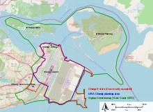 The terrain in Changi is generally flat because most of Changi today sits on reclaimed land, there are however three notable hills in the Changi Village area, Battery (Biggin) Hill, Fairy Point Hill and Temple Hill.[6] The ground conditions on reclaimed land however were soft marine clay which could not support the runway and taxiways of the airport, and thus works had to carried out accordingly to drain the water and strengthen them.[13] There are also two reservoirs located in Changi, the Changi Creek Reservoir and South End Reservoir which are located to the north and south of Changi Airport respectively. The Changi planning area as defined by the Urban Redevelopment Authority encompasses the subzone of Changi Airport, Changi Point and Changi West, although in comparison to the parliamentary electoral boundaries or the Changi Estate that is commonly known in public they all differ from one another slightly.
