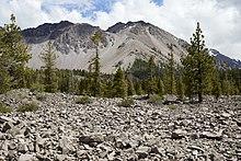 Between 385,000 and 315,000 years ago, volcanic activity in the Lassen volcanic center shifted dramatically from building andesitic stratovolcanoes to producing lava domes made of dacite. These eruptions formed the Lassen dome field, staged as andesite lava flows surrounding two sequences of dacitic lava domes. The first sequence of lava domes, known as the Bumpass domes, formed between 300,000 and 190,000 years ago, while the production of the younger Eagle Peak domes began about 70,000 years ago. The andesite lava flows form the older and younger Twin Lakes sequences, and date to between 315,000 and 240,000 years ago and between 90,000 years ago and present, respectively. Beginning 190,000 years ago, eruptions ceased in the Lassen Volcanic center for 100,000 years.[11] Dacitic magma at the Lassen center formed from mafic (rich in magnesium and iron) magma meeting silicic (high in silicon dioxide) magma chambers with felsic (rich in feldspar and quartz) phenocrysts.[3] Some dacitic crystals were partially reabsorbed as a result of mixing of hot mafic magma with cool dacitic magma, and this along with undercooling of mixed magma led to phenocryst variation within certain domes exceeding variation between the domes.[3] All three sequences — Bumpass, Eagle Peak, and Twin Lakes — formed from lava subjected to magma-mixing processes, accounting for their heterogeneous appearance and composition.[11] Because of these mixing mechanisms, lavas may have different compositions but similar appearances, or similar compositions with different appearances.[3] The eruption that produced the Chaos Crags consisted of more than 90% mixed magma,[12] and likely resulted from the interaction of felsic and mafic magmas.[13]