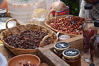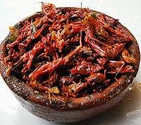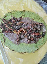 One of the regions of Mexico where chapulines are most widely consumed is Oaxaca, where they are sold as snacks at local sports events and are becoming revived among foodies.[1] There is one reference to grasshoppers that are eaten in early records of the Spanish conquest, in early to mid 16th century.[2]