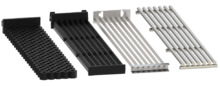 The grate is the cooking surface of a charbroiler (also known as the cooking grid), and often has a wide range of geometries and materials to meet operational requirements of the user. It is usually an array of ribs oriented front-to-back, commonly with reinforcing members across the middle, either at or below the cooking surface. Cast iron is the most common material used for grates, though steel rods of varying diameters are also readily available.
