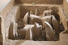 The oldest known chariots have been found in burials of the Sintashta culture in modern-day Russia.[3] Starokorsunskaya kurgan in the Kuban region of Russia contains a wagon grave (or chariot burial) of the Maikop Culture (which also had horses). The two solid wooden wheels from this kurgan have been dated to the second half of the fourth millennium. Soon thereafter the number of such burials in this Northern Caucasus region multiplied.[5][6]