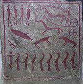 In addition to the Trundholm chariot, there are numerous petroglyphs from the Nordic Bronze Age that depict chariots. One petroglyph, drawn on a stone slab in a double burial from c. 1000 BC, depicts a biga with two four-spoked wheels.