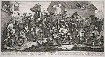 Skimmingtons are recorded in England in early medieval times and they are recorded in colonial America from around the 1730s.[22][23] The term is particularly associated with the West Country region of England and, although the etymology is not certain, it has been suggested that it derived from the ladle used in that region for cheesemaking, which was perceived as a weapon used by a woman to beat a weak or henpecked husband. The rationale for a skimmington varied, but one major theme was disapproval of a man for weakness in his relationship with his wife. A description of the custom in 1856 cites three main targets: a man who is worsted by his wife in a quarrel; a cuckolded man who accepts his wife's adultery; and any married person who engages in licentious conduct.[24] To "ride such a person skimmington" involved exposing them or their effigy to ridicule on a cart, or on the back of a horse or donkey. Some accounts describe the participants as carrying ladles and spoons with which to beat each other, at least in the case of skimmingtons prompted by marital discord. The noisy parade passed through the neighbourhood, and served as a punishment to the offender and a warning to others to abide by community norms; Roberts suggests that the homes of other potential victims were visited in a pointed manner during a skimmington.[24] According to one citation, a skimmington was broken up by the police in a village in Dorset as late as 1917;[14] and incidents have been reported from the 1930s, the 1950s and perhaps even the 1970s.[15]