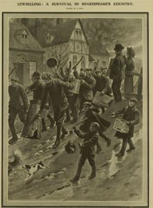 In Warwickshire, the custom was known as "loo-belling" or "lewbelling",[13] and in northern England as "riding the stang".[14] Other names given to this or similar customs were "rough-musicking" and "hussitting" (said to be a reference to the Hussites or followers of John Huss).[15]