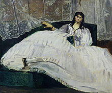 Manet and Baudelaire became constant companions from around 1855. In the early 1860s, Baudelaire accompanied Manet on daily sketching trips and often met him socially. Manet also lent Baudelaire money and looked after his affairs, particularly when Baudelaire went to Belgium. Baudelaire encouraged Manet to strike out on his own path and not succumb to criticism. "Manet has great talent, a talent which will stand the test of time. But he has a weak character. He seems to me crushed and stunned by shock."[34] In his painting Music in the Tuileries, Manet includes portraits of his friends Théophile Gautier, Jacques Offenbach, and Baudelaire.[35] While it's difficult to differentiate who influenced whom, both Manet and Baudelaire discussed and expressed some common themes through their respective arts. Baudelaire praised the modernity of Manet's subject matter: "almost all our originality comes from the stamp that 'time' imprints upon our feelings."[36] When Manet's famous Olympia (1863), a portrait of a nude prostitute, provoked a scandal for its blatant realism mixed with an imitation of Renaissance motifs, Baudelaire worked privately to support his friend, though he offered no public defense (he was, however, ill at the time). When Baudelaire returned from Belgium after his stroke, Manet and his wife were frequent visitors at the nursing home and she would play passages from Wagner for Baudelaire on the piano.[37]
