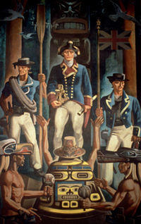 The Canadian National Railway commissioned Captain Vancouver for Hotel Vancouver in 1939. After months of research and planning, Comfort decided to depict a hypothetical encounter between Captain George Vancouver and an unnamed Indian chief at a potlatch ceremony. Comfort researched the clothing of the era and consulted Aboriginal anthropologist Dr. Marius Barbeau and others. The painting was removed in 1969 when the hotel was renovated. The wife of Governor General of Canada Roland Michener discovered the work after it was briefly misplaced and donated it to the University of British Columbia. From this time aboriginal viewers have raised concern over the representation of the First Nations people, as Captain Vancouver physically stands triumphantly over the aboriginal men.[10]