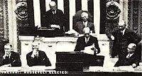 Following the stock market crash in 1929, the problems of the Great Depression deepened during the Hoover administration and resulted in the defeat of the Republican ticket in 1932. The Democrat Franklin D. Roosevelt was elected in 1932 as president, with a popular vote of 57% to 40%. Curtis's term as vice-president ended on March 4, 1933.[25] Curtis's final duty as vice president was to administer the oath of office to his successor, John Nance Garner. Garner's swearing-in ceremony was the last to take place in the Senate Chamber.[26]