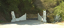 From 1925 until his death in 1944, Wood lived with his second wife, Sara Bard Field, in Los Gatos in a house named "The Cats" or the "Cats Estate" located on the hill on southbound Highway 17.[10] The house was built in 1925 on a 34-acre property, with an entry way featuring a wrought iron gate flanked by two large white cat sculptures, named Leo and Leona.[10] Many artists had visited this home including Charlie Chaplin, Eleanor Roosevelt, and John Steinbeck.[10]