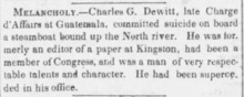 DeWitt committed suicide[6] on board a steamboat in Newburgh, New York on April 12, 1839, and is interred in the Dutch Reformed Cemetery in Hurley, New York.[7]