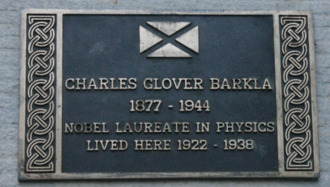 A plaque exists on Barkla's house at Hermitage of Braid in Edinburgh. A commemorative plaque has been installed in the vicinity of the Canongate, near the Faculty of Education Buildings, at the University of Edinburgh. Additionally, a lecture theatre at the University of Liverpool's Physics department, as well as a Biophysics laboratory in the Biological science department,[15] are named after him. In 2012 a gritter in Barkla's home town of Widnes was named in his honour, following a competition run by the local newspaper.[16]