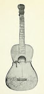 The guitar is of Italian workmanship and still bears intact and perfect the original label of its maker, "Gaetano Vinaccia, Napoli, Rua Catalana, No. 46, 1834". It is constructed of native maple wood without figure, the back and sides being varnished golden yellow. The edges of the table were originally inlaid, but this decoration is now missing. The ebony bridge has been at some late period attached to the table very rudely by two rough screws, and the points of the bridge terminate with fanciful and delicately carved tracery in ebony, which is placed in relief over the lower part of the table. Its fingerboard shows signs of having been decorated also, and there remain but three of its pegs. It was damaged during the Siege of Paris (1870–71), when a Prussian artillery officer kicked it. Its body, head, neck, and fingerboard got scorched by fire and its back was ripped off. A friend of Gounod's found it and put it in the Museum of the Paris Opera.[11]