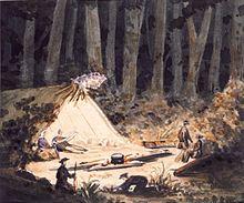 Night-time camping scene at Rangiora bush with John Robert Godley, Charlotte Godley, Arthur Godley, Charles Torlesse, Charles Hunter Brown, and Jerningham Wakefield. Painted on 6 December 1850 by Frederick Weld.