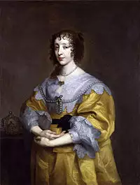On 1 May 1625 Charles was married by proxy to Henrietta Maria in front of the doors of the Notre Dame de Paris, before his first Parliament could meet to forbid the banns.[37] Many members were opposed to the king's marrying a Roman Catholic, fearing that Charles would lift restrictions on Roman Catholics and undermine the official establishment of the reformed Church of England. Although he told Parliament that he would not relax restrictions relating to recusants, he promised to do exactly that in a secret marriage treaty with Louis XIII of France.[38] Moreover, the price of marriage with the French princess had been to place under French command an English naval force that would be used to suppress the Protestant Huguenots at La Rochelle, thereby reversing England's long held position in the French Wars of Religion. The couple married in person on 13 June 1625 in Canterbury. Charles was crowned on 2 February 1626 at Westminster Abbey, but without his wife at his side because she refused to participate in a Protestant religious ceremony.[39] Charles and Henrietta Maria had nine children, with three sons and three daughters surviving infancy.[40]